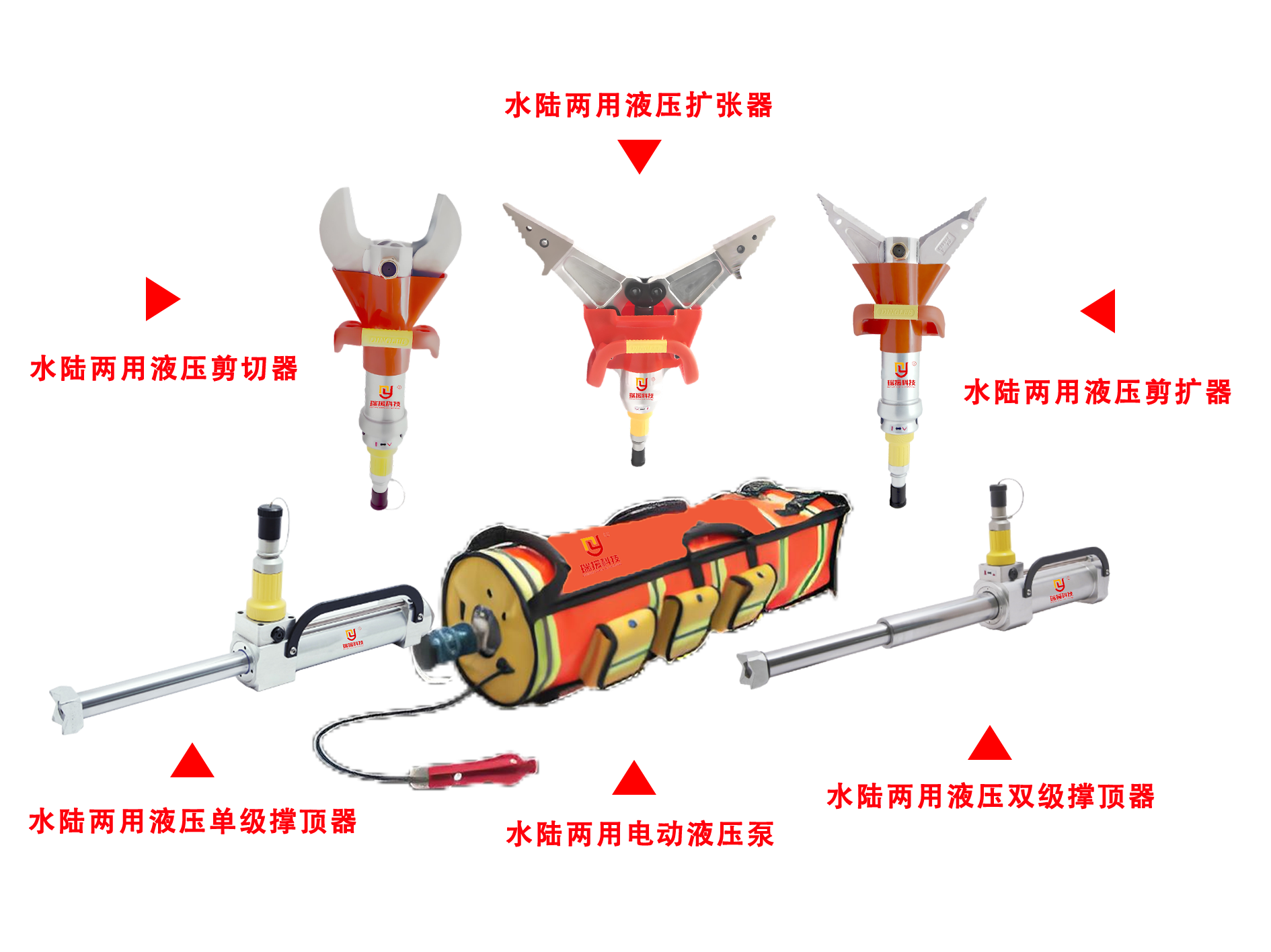 水陆两用救援工具组既可满足陆地上的交通事故、地震灾害及各种意外事故的救援要求还可完成水下100米内的车辆、船舶及飞机等复杂的水下救援任务,是救援人员真正需要的高强度、多应用、高效率的液压破拆工具组。