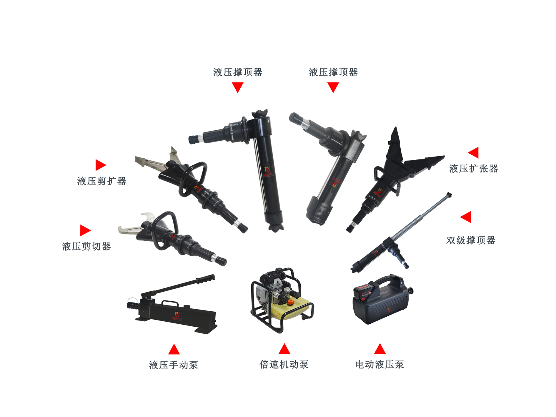 本套液压破拆工具组是应急救援核心装备,涵盖倍速机动泵、电动/手动液压泵、剪切器、剪扩器、扩张器及多规格液压撑顶器。全系列采用高强度合金/航空轻质铝合金打造,搭配德氏封密封件,兼顾强度、轻便性与密封可靠性。