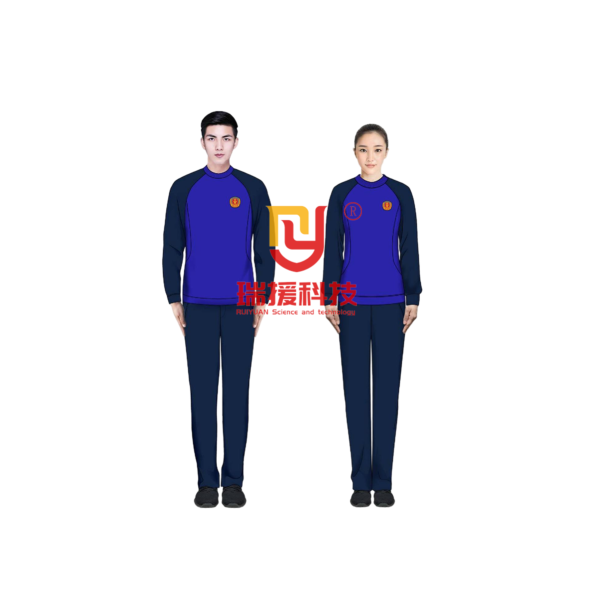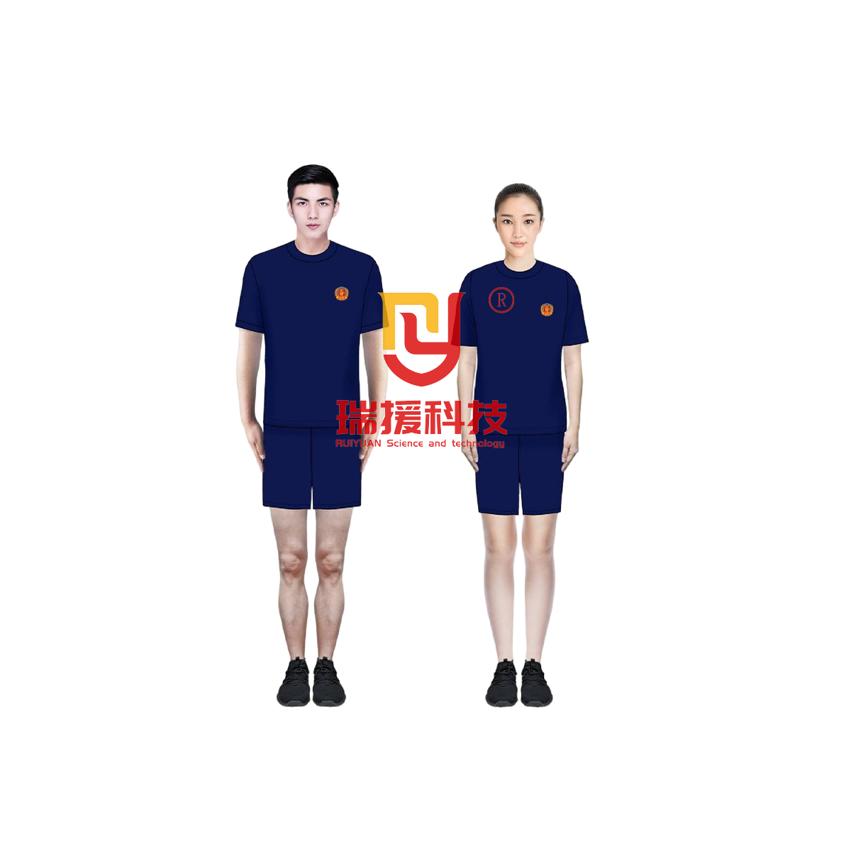 主面料为涤棉夹层针织布(袖深藏蓝色,身火焰蓝色)。纬编双面组织,由18tex精梳棉纱(紧密纺)、83dtex/72f消光涤纶低弹丝、含有TiO2的111dtex/72f十字截面涤纶低弹丝和22dtex/3f涤纶导电纤维组成,其中TiO2含量不低于2.25%,面料干重:260±15g/㎡。